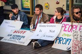 | Sit-in protesting anti-homeless policies. Image credit: Darcy, Alex. "Resisting the Sit-Lie Ban and Business Owners in Downtown Monterey." Santa Cruz IMC. Web. 26 January 2016. |